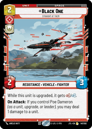 Jim — Last pick….man, there are a few more I would like to take! I have a grouping of cards I love like Electromagnetic Pulse, Shoot Down, and Heartless Tactics that all give more than one benefit, there are a few pilots I love like Biggs Darklighter and Dengar. There are some neat combo cards like Close the Shield Gate and finally trying to get Galactic Ambitions to work or AT-DP with Jango or Mace (of course probably only the former), and something easy and simple like Salvage to get back a Falcon (set 1). But I digress. I’ll take a card that should function like a set 1 Sabine Wren, Explosives Artist and take Black One, Straight At Them. Same cost, pretty easy +1 feature and works great with Poe. Should be a lot more playable than Anakin’s Interceptor.
