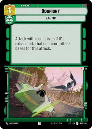 I think the most salient point I’ve seen against Dogfight is that sometimes it’s a slightly worse Timely Intervention. While I think that’s overly reductive to begin with, I also think it’s a backhanded compliment- Timely Intervention is still a super relevant card that shows up at top tables all the time. Extra triggers of potent on attack effects are great. Not having to choose between hitting base or removing a threat with your best unit is great. Taking advantage of your opponent thinking that unit you just played can’t hurt them this round is great. The card is cheap, flexible, and its ceiling is potentially game winning. That’s the exact formula that has historically put events in the competitive tier. I believe we’re gonna see a ton of this card in a variety of shells.
