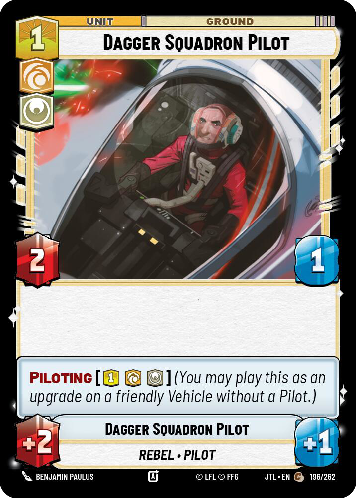Piloting– The Piloting keyword allows a unit card to also function as an upgrade on Vehicle units. This gives them extra flexibility, which will generally lower their expected unit stats by one. The example above showcases how a 1-cost ground unit that would normally be a 2/2 is a 2/1 with piloting. However, we’re not typically going to evaluate pilots for their ground unit stats, instead we’ll look at their piloting ability. A 1-cost pilot should give the receiving vehicle +3 stats (reflecting the limited options where the pilot can be played and the risk in doing so.) From there, their stats scale at the same +1/+1 rate that an upgrade normally would, making a +2/+3 pilot upgrade on curve.