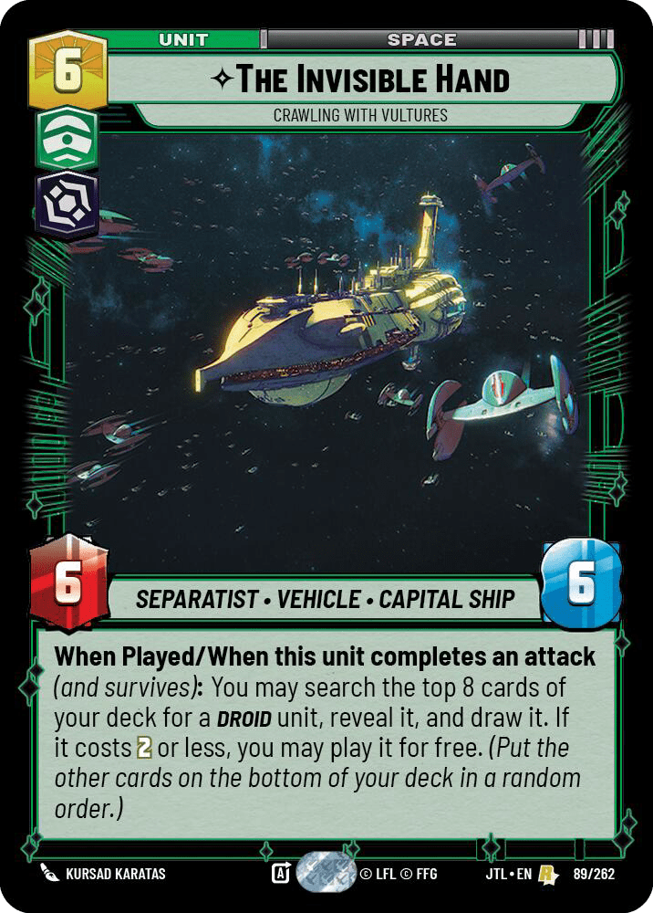 A 6-cost space unit should have 13 stats, so the IH is slightly under on a simple reading of the stats. However, the ability can not only fish a card out of your deck (equivalent to drawing a card) but also play it if it’s a 2-cost droid unit. In total, that’s 8.5 resources worth of value for the 6 you paid. Pairing with Triple Dark Raid is where this really goes off the charts. You pay three for TDR, bring out the IH (1 Resource Equivalent), grab a droid (1RE), play the droid (2RE), hit base for 6 (3RE), grab another droid (1RE), and finally play that droid (2RE). That’s value equivalent to 10 resources for your originally investment of 3!