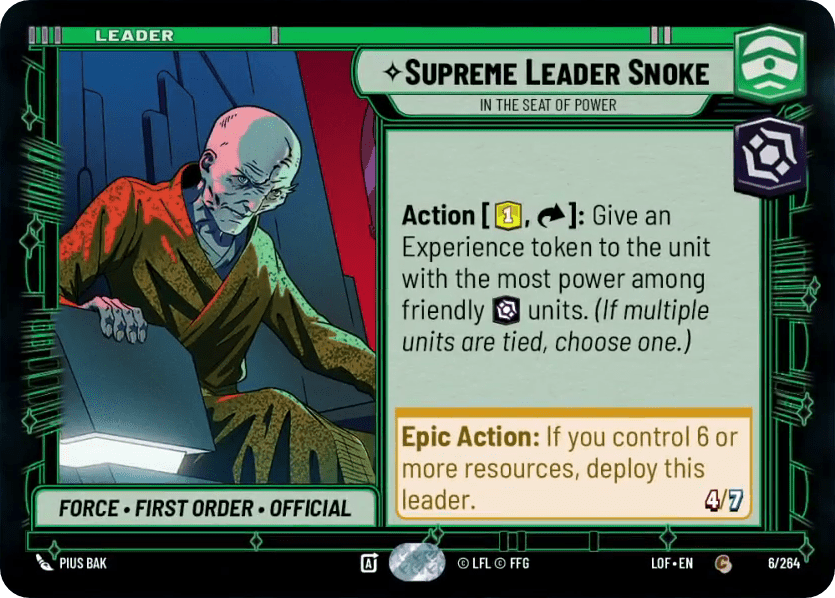 We already have several leaders with similar abilities to Snoke – namely Tarkin. While Snoke is slightly less conditional than Tarkin, he’s also less flexible. Therefore, it’s hard to say that Snoke is a better leader. Since Tarkin only sees play at the fringes of the meta, we can logically assume that that’s Snoke’s ceiling.