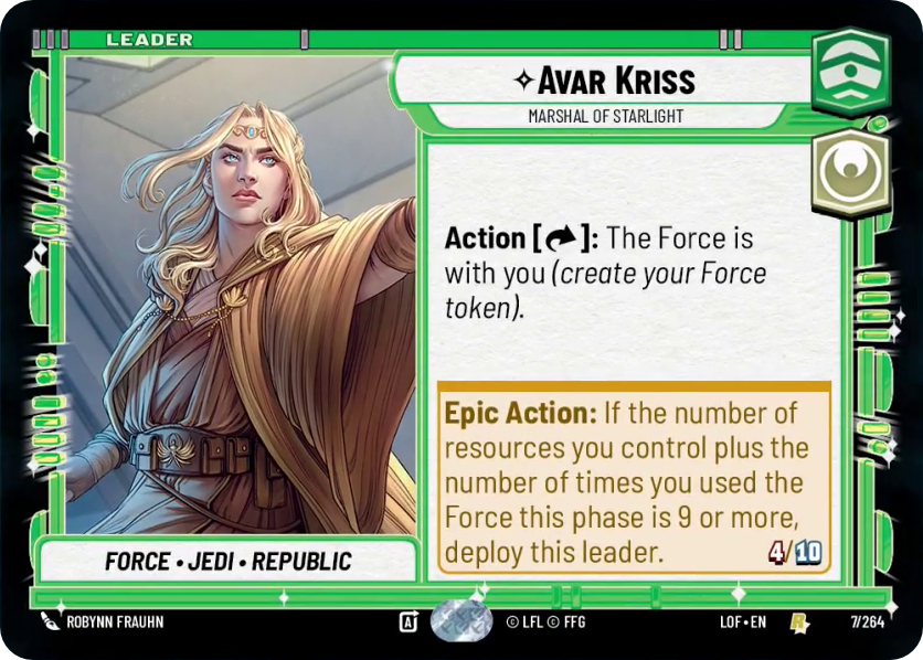 Avar is the leader in the set most explicitly tied to the Force mechanic. The good news is that her color, Hero Command, got the best crop of Force cards in Legends. Yoda, Eeth Koth, and Jedi Consular are all power cards that can leverage her ability. Initial plays seem to indicate that her late deploy isn’t the huge liability it is for some other leaders as she’s often coming down as an 8/10 Overwhelm at 7 resources. It’s hard to see her not getting heavy play in the early meta.