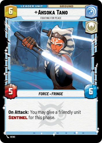 Ahsoka doesn’t give us the same deckbuilding opportunities as Kylo. While there are some units that benefit from being attacked and could provide Ahsoka with some synergy, her overall power level is pretty low. Using the Force to give a unit sentinel for a single turn is probably not a profitable trade, and Ahsoka herself has poor stats for a 6-deploy leader. It’s a shame such a fan-favorite character (with great art!) is such a snooze.