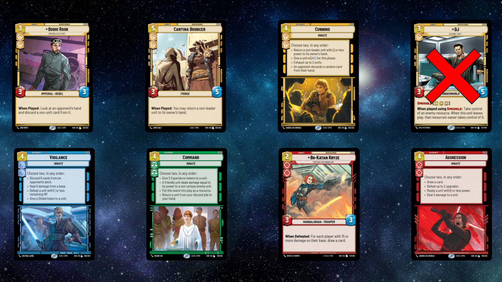Twilight turned out to be a design misstep on many levels, but it was particularly bad for mono cards. Outside of the intentionally (and hilariously) unplayable Jar Jar Binks, all the mono cards from Twilight flopped. To add to this, DJ was subsequently banned, meaning the pool of playable double aspect cards actually shrunk over this period. And as other color combinations continued to get new power cards and synergies, mono strategies could no longer muster the competitive umph to keep up.