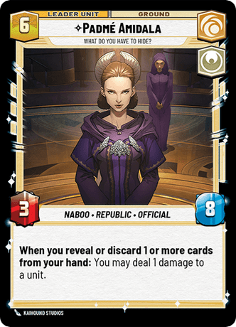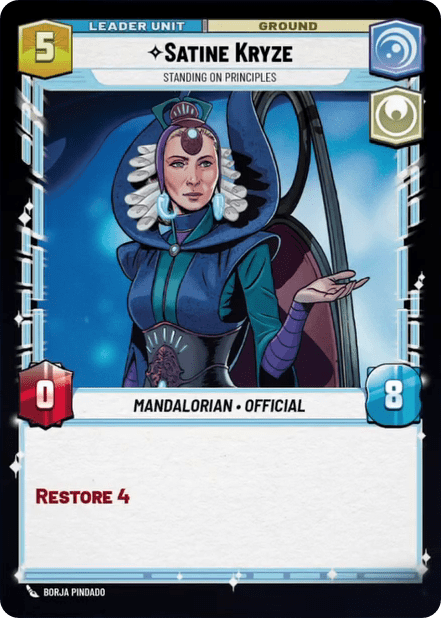 Satine comes to us as a sort of reverse Anakin. Instead of damaging your base to increase power and trade more effectively, she heals your units to make them more survivable. Likewise, on her unit side she heals your base instead of doing damage. Not sure the design inversion works in Satine’s favor, though… The leader side can interact well with self-damaging units like Royal Guard Attache and Dilapidated Ski Speeder, but that doesn’t produce anything more than the 2/5s Rey can already produce in round 1 (without damaging base.) On the unit side, a leader that can be freely attacked with no consequences doesn’t stand much of a chance in our board-centric world.