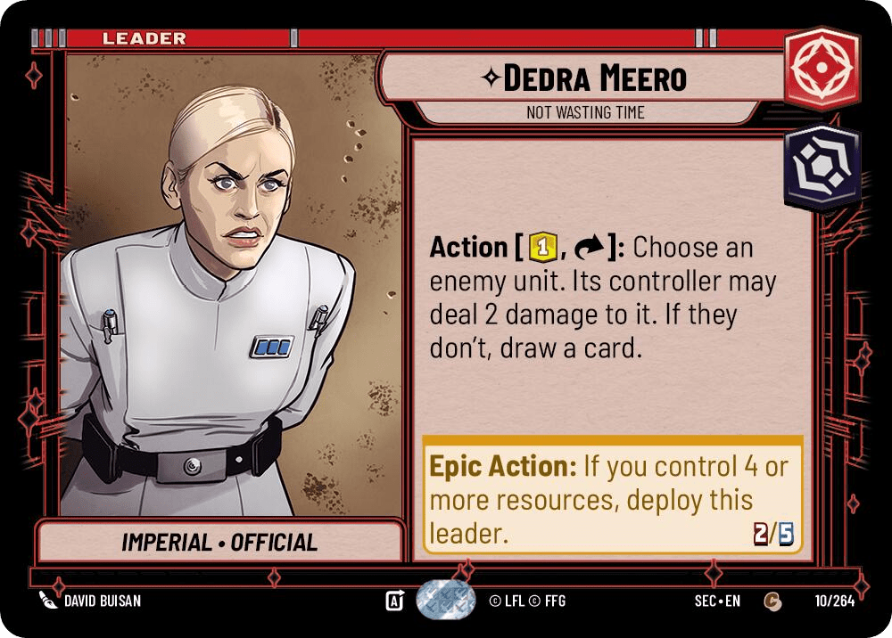 Don’t let Deedra’s four resource deploy fool you. She is not an aggro leader- she’s a hard control leader. Think about the set 1 card I Am Your Father. Where was it useful? …only in hard control builds like Bossk/Blue. Likewise, that’s the only place where Deedra’s choice between damage and card advantage will work in her owner’s favor. Now, will she turn out to be a better leader in that archetype than Bossk or Iden? TBD. But if she’s playable, that’s where it will be.