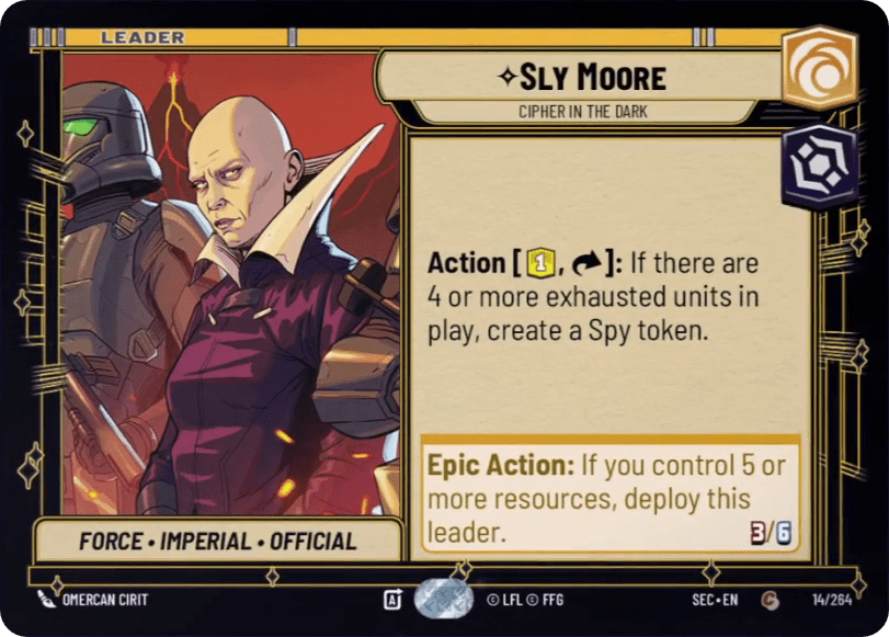 Sly Moore has a very conditional leader side which can produce a Spy token on rate, but probably not before the 4-resource turn. Her unit side is slightly more appealing with a strong “On Attack” ability that helps make up for her below rate stats. It’s also worth pointing out her trio of relevant traits. However, it’s hard to see how Sly achieves the synergies required to be a meta deck. The “four exhausted units” condition would need to prove much easier than expected, and Spy tokens will need to functionally operate as much more than the 0/2 Raid 2’s they’re printed at.
