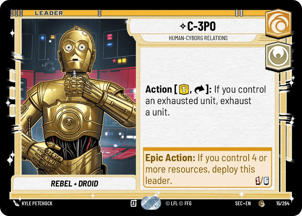 Since players typically attack with their best units as the first action of their turns, exhaust effects get less useful the further into a given round you go. Since Threepio requires us to have an exhausted unit in play to trigger his ability, and we won’t be able to use it as our first action, that exhaust won’t pack much punch. Furthermore, his leader side is weak, putting only a single power on the board. Yeah, yeah, Babu Frik is a thing and could make 3P0 hit for 6, but relying on a 1-cost unit staying in play to make your leader useable is not a competitive strategy.