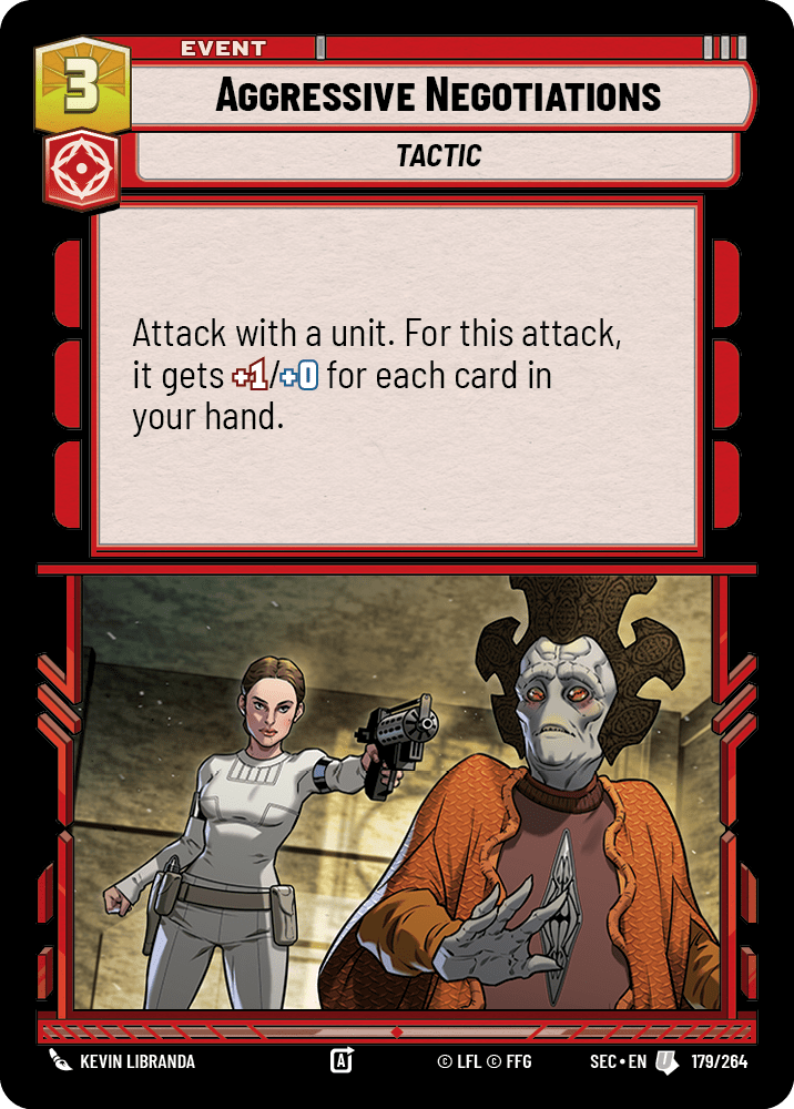 That said, the best cards are versatile and fit into many archetypes. So I am going to choose a card that could fit into almost any deck in its color: Aggressive Negotiations. This card will consistently allow an attack with +3 or +4, and in decks that already play the #2 pick from last draft, Ki-Adi-Mundi, this is a monster. I think that just by existing, this card will force your opponent to play around it in the same way they must play around suprise strike, but it will have a longer reach.
