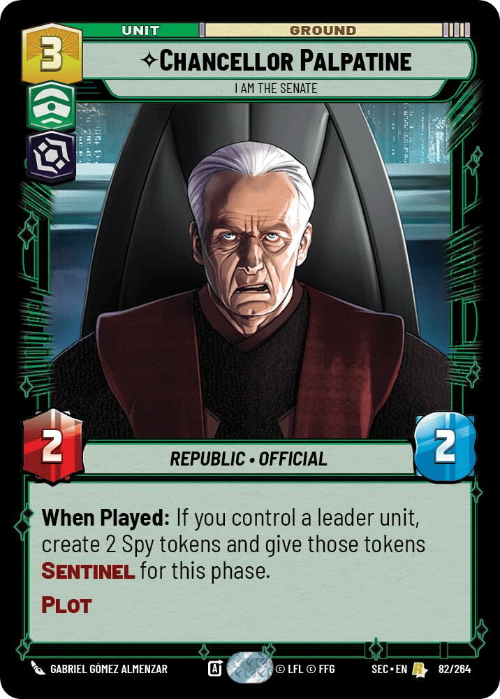 Stephen — Oh boy this was a tough one for first pick, but I have to go with Chancellor Palpatine. Sure it’s a 2/2 but that delicious Plot trigger giving you 2 spy tokens with Sentinel opens so many doors. Instant Coordinate (who remembers that one?), you can Exploit, you can do all sorts of neat things. It’s also in the best color combo (long live green villainy!)
