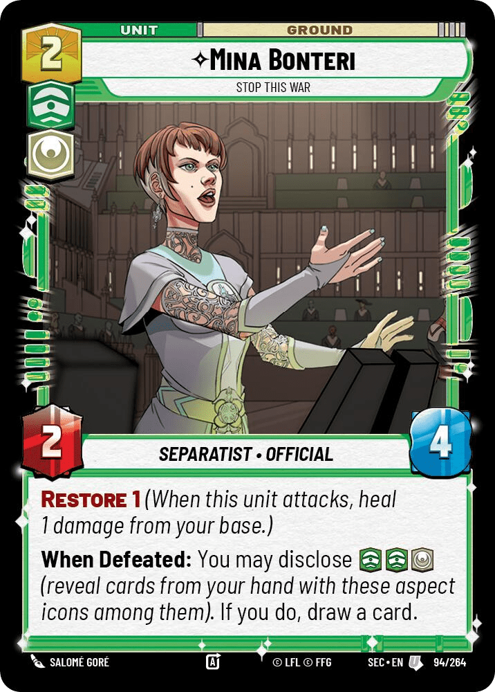 wooooo — So this set has brought in an abundance of powerful two drops, and I’ll be taking one that was previewed towards the end. Mr. Nemik (Karis Nemik) is the pick. 3/2s have mostly been powercrept out of the format due to the abundance of 2/4s, but this guy isn’t going down without a fight. Not only is he hidden, but he also explodes in to a new unit! That’s a lot of value from your two drop. He comes with the handy rebel trait, and the disclose can even be upside if you run him in a Padme deck. Regardless, I can see him being a mainstay in a variety of decks, from hard aggro to midrange board control style builds.
