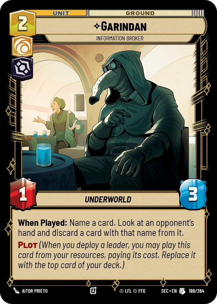 wooooo — Garindan finally gives yellow villain some actual targeted discard. Bazine is fantastic, but often not enough. Underworld upside is fantastic, and Garindan will have 4 months to synergize with Cad and Ma Klounkee before they both rotate.