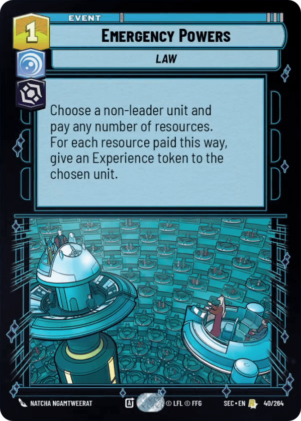 Tyler — Alright, I get to close out round 3 and start round 4. I’m going to begin with Emergency Powers. This card might be the best “upgrade” in the game. The ceiling is infinite since I can add as many experience as I want. But unlike most large upgrade cards, I don’t risk being blown out by individual upgrade hate. There’s also fun synergy with cards like Vanee, Axe Woves, and Gar Saxon. We say that Gar gets great cards every set and it’s just true.