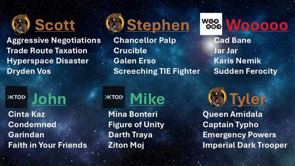 John — I’m so excited to make my next pick that I can’t wait to make it. I know it’s not coming back around and suspect both Bobby and Wooooo have it next on their list. I’m going to slam Garindan for my pick here. Playing both with and against this card this past week has been wild. He seemingly never misses and just does some very unfair things combined with Thrawn1, Ma Klounkee, and more. I’m thrilled to have him fall to me.